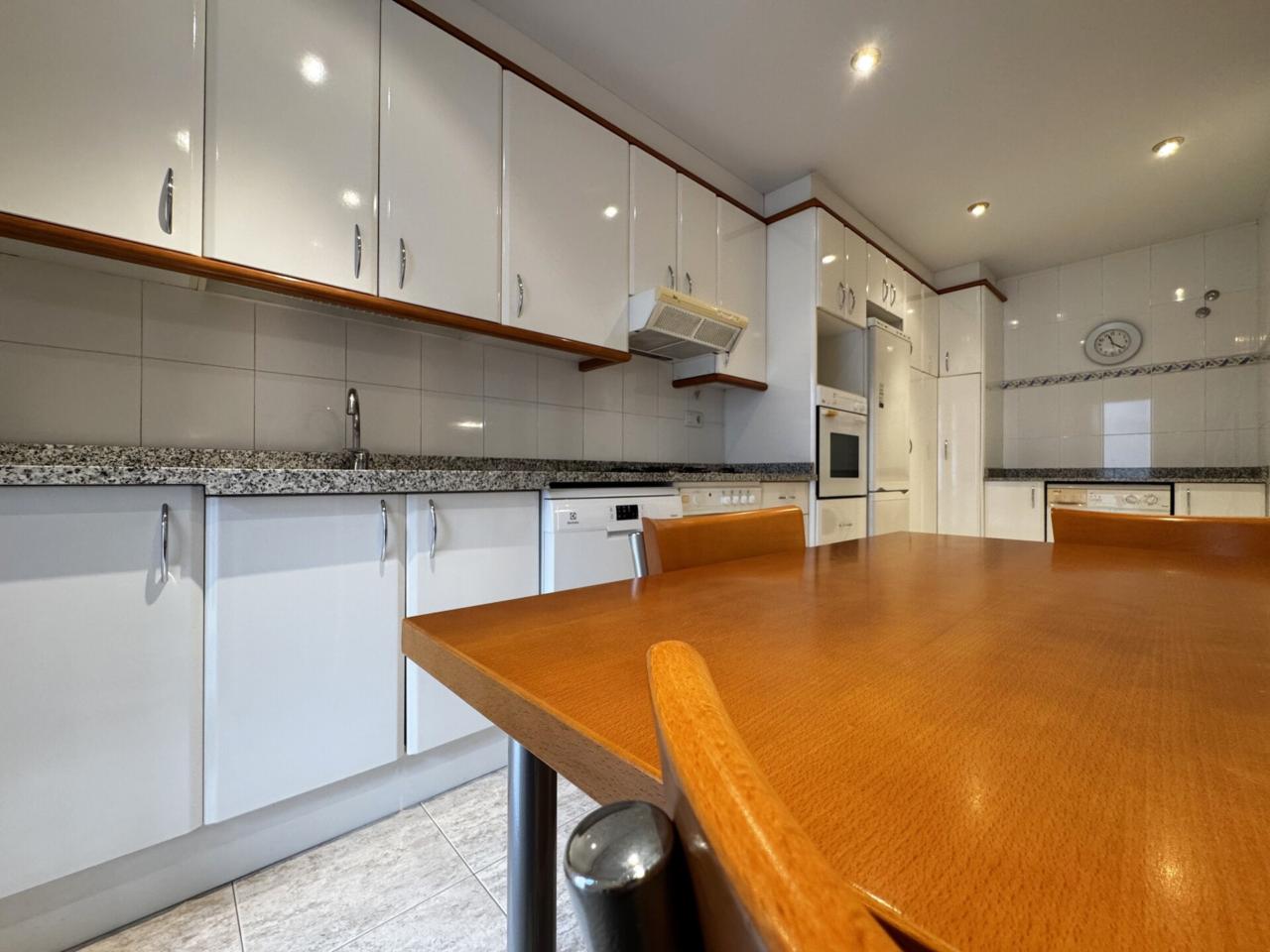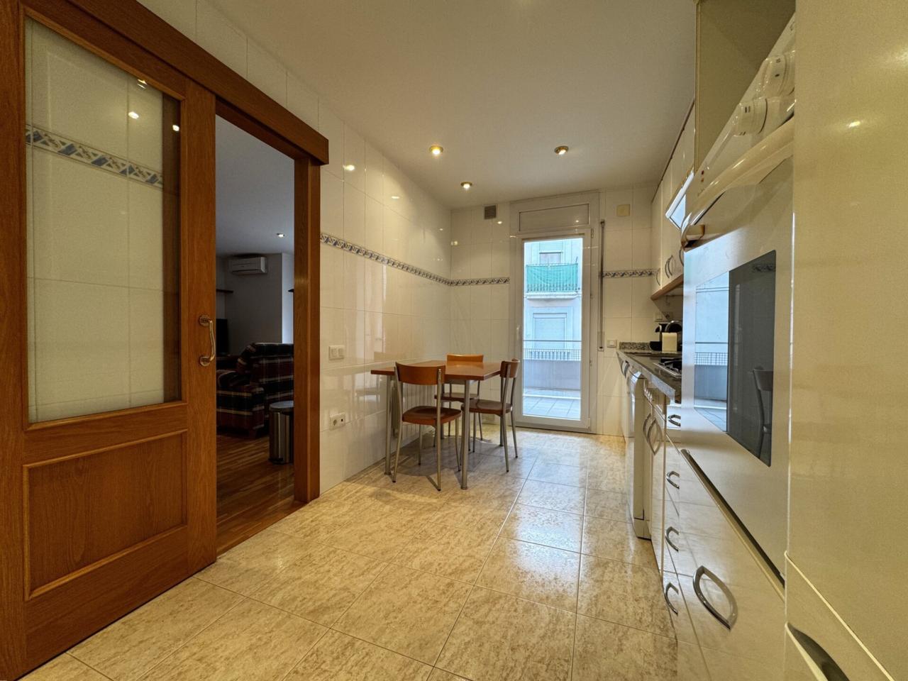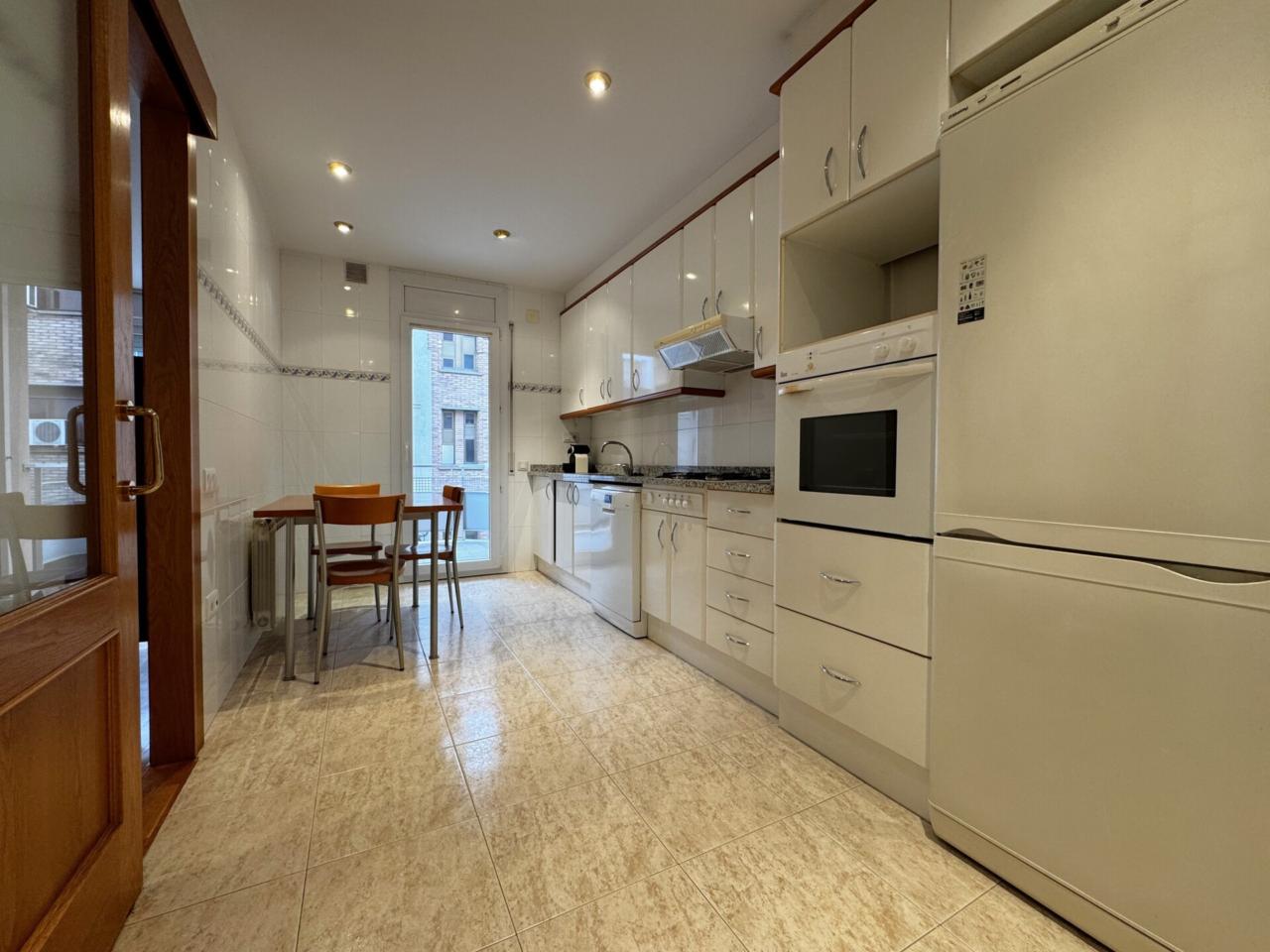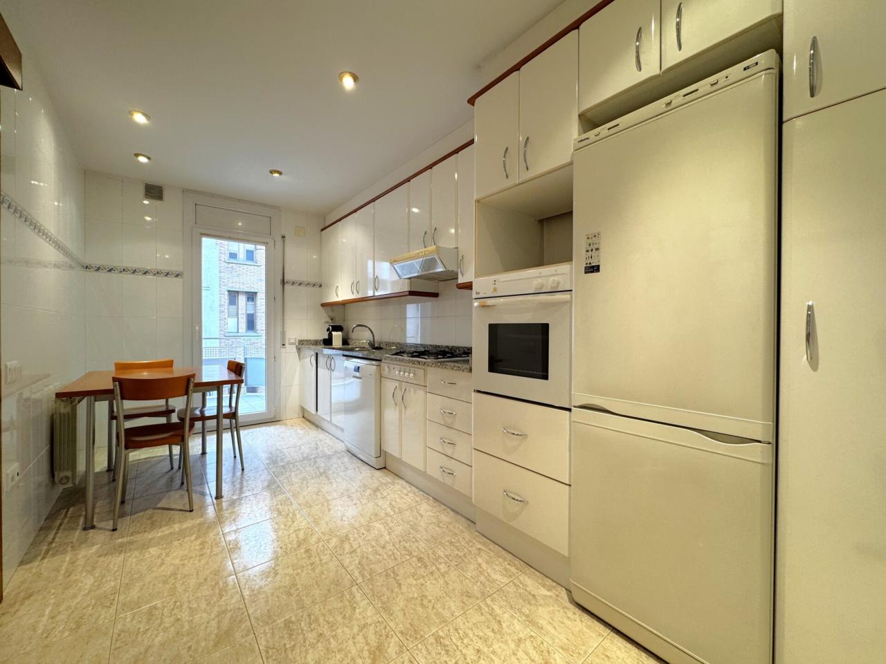 L’espai compta amb un ampli menjador amb grans finestrals, que inunden l’ambient de llum natural i donen accés a un balcó de façana molt agradable, també accessible directament des de la cuina office, àmplia i funcional, que inclou una pràctica zona de safareig.