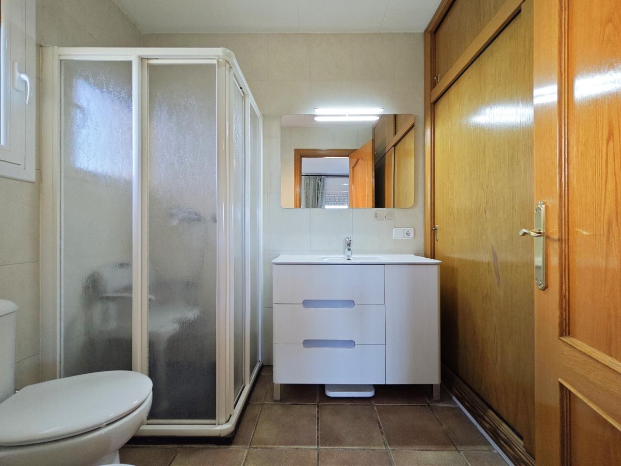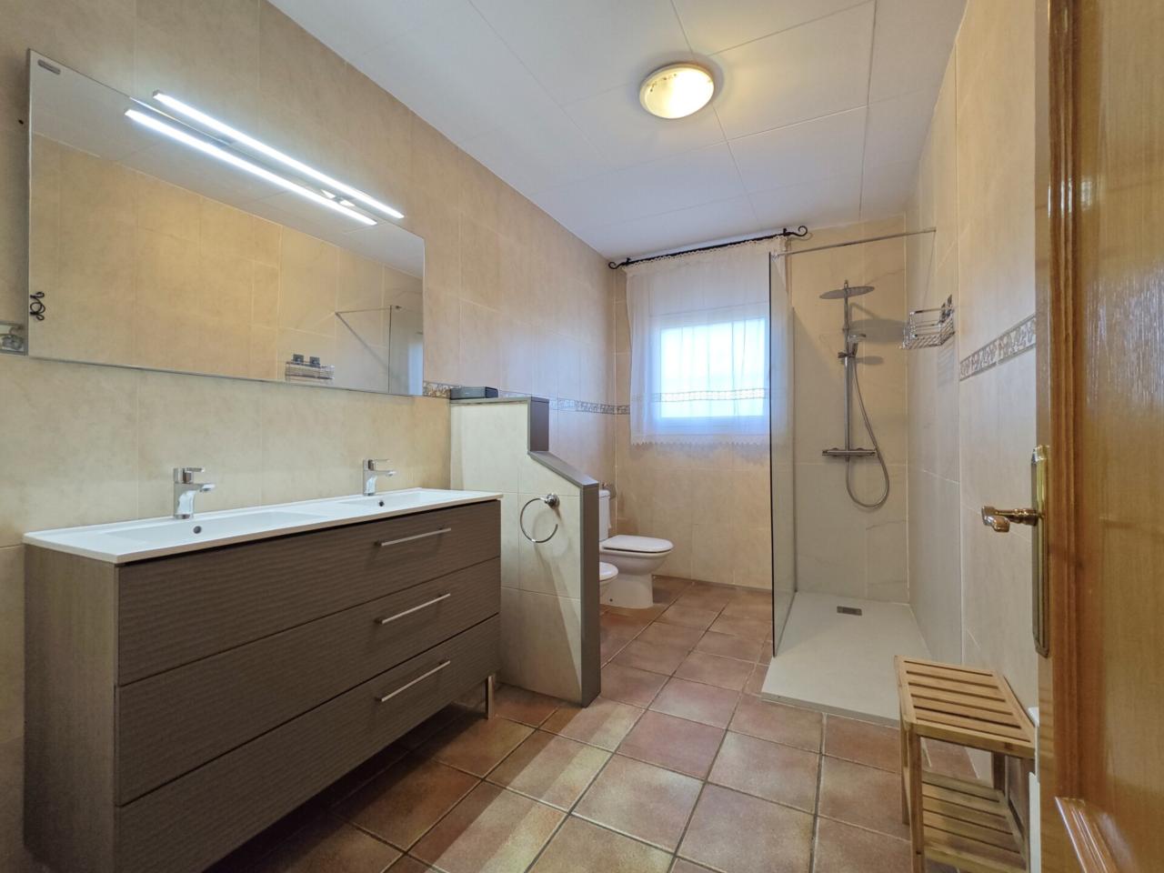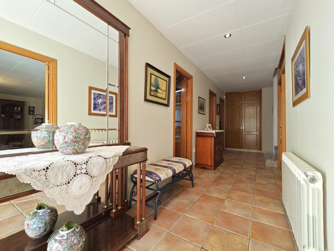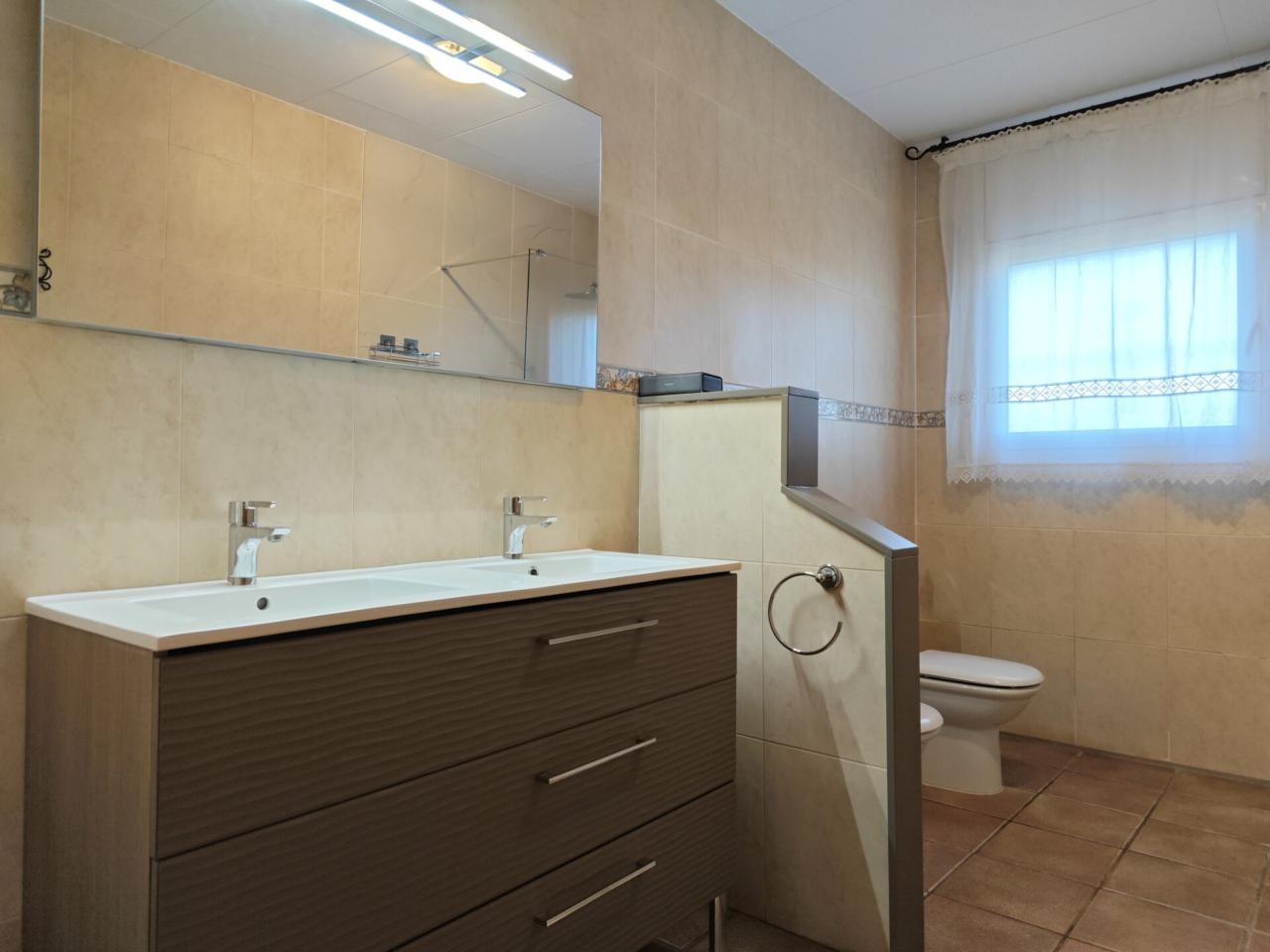 Ampli distribuïdor amb armari encastat, que dona la benvinguda i connecta amb la resta d’espais de la casa. Des d’aquí accedim també a un gran bany complet, amb dues piques de mans, una àmplia dutxa amb vidre de seguretat i finestra exterior que garanteix ventilació i llum natural.
