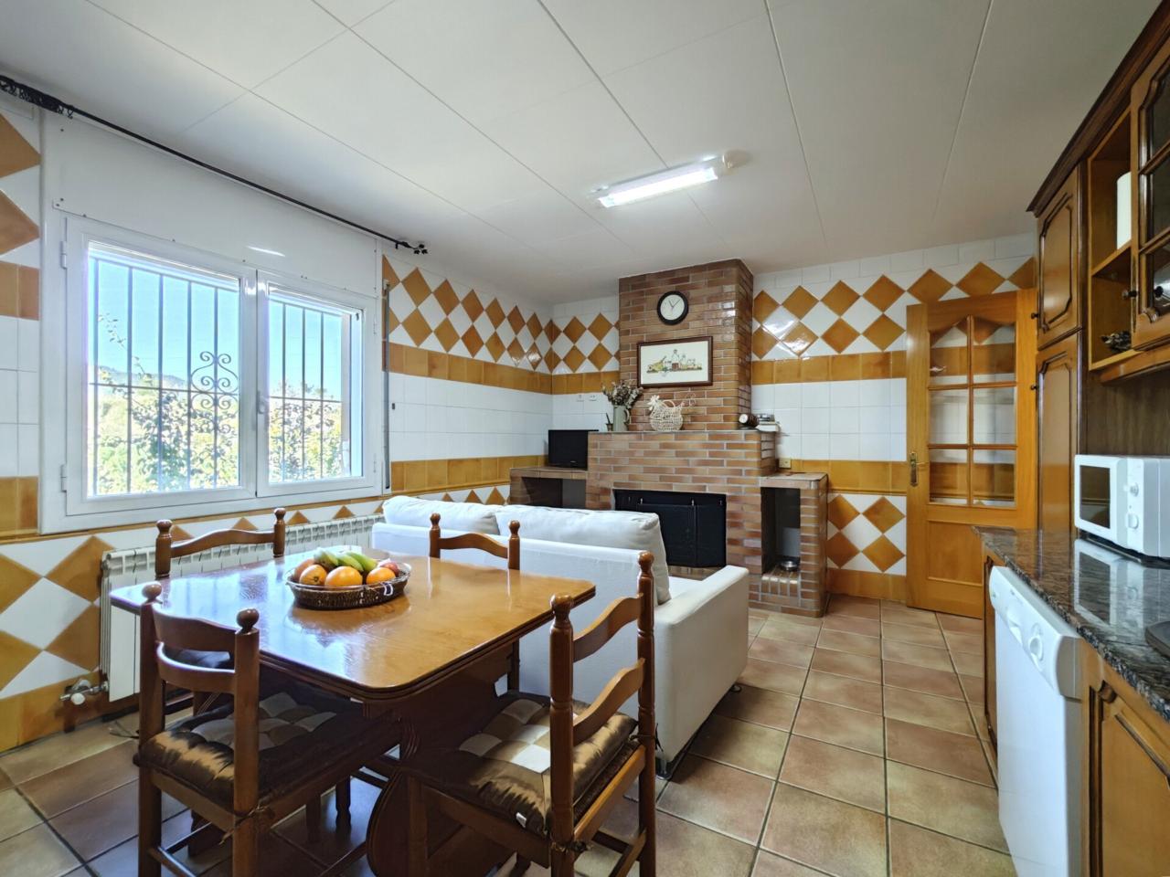 Cuina office àmplia, amb mobiliari rústic i una encantadora llar de foc, ideal per a les trobades a la vora del foc. Al costat, un pràctic rebost que aporta comoditat i ordre.