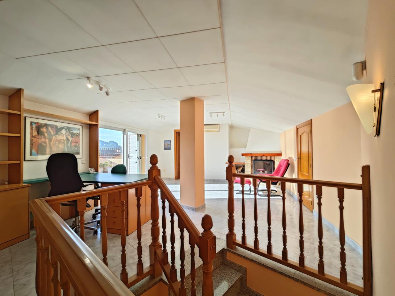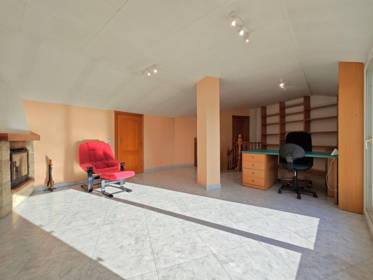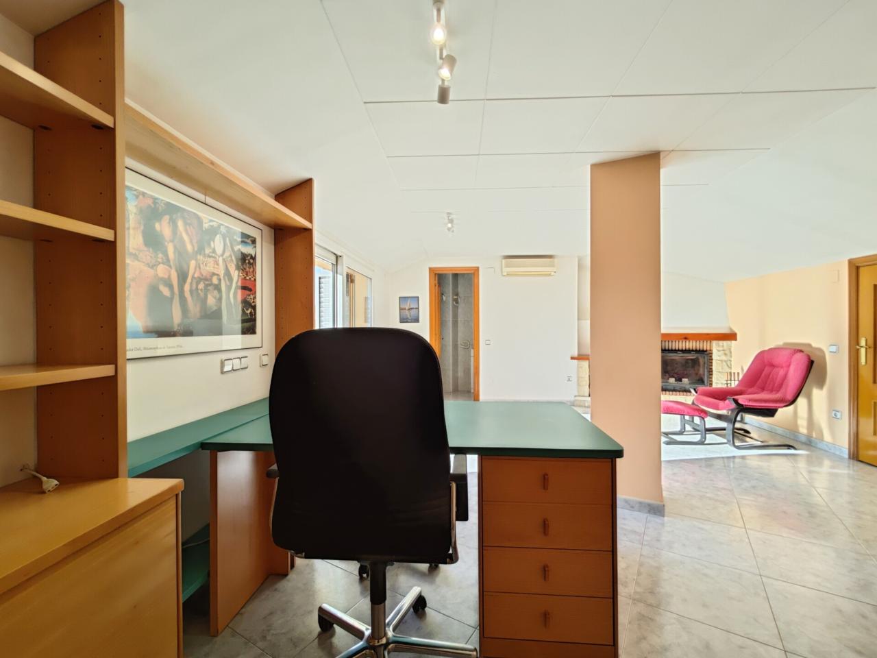 A la planta superior hi trobem un gran estudi, un espai tranquil i acollidor, ideal com a zona de treball o descans, amb el valor afegit d’una càlida llar de foc.