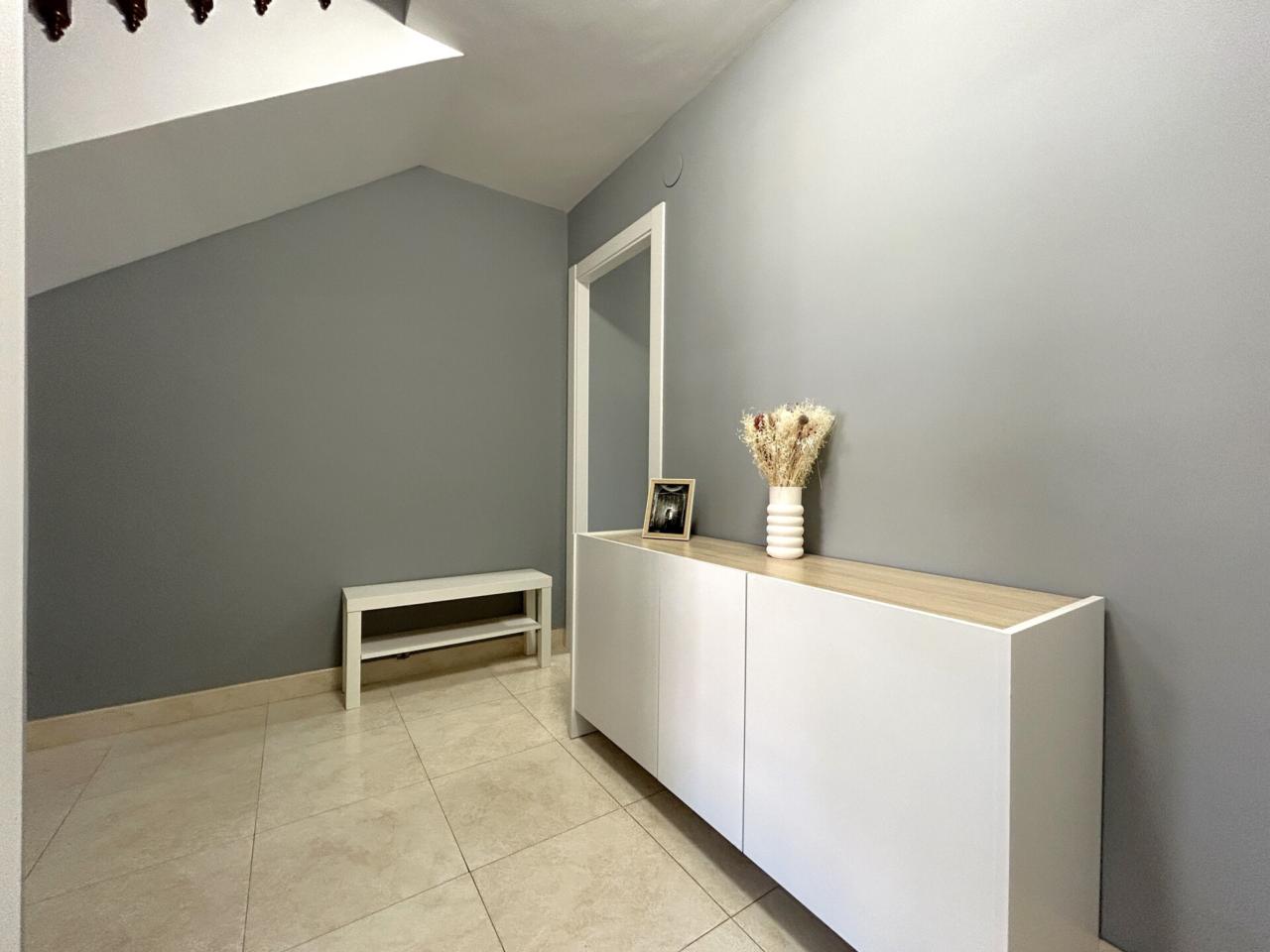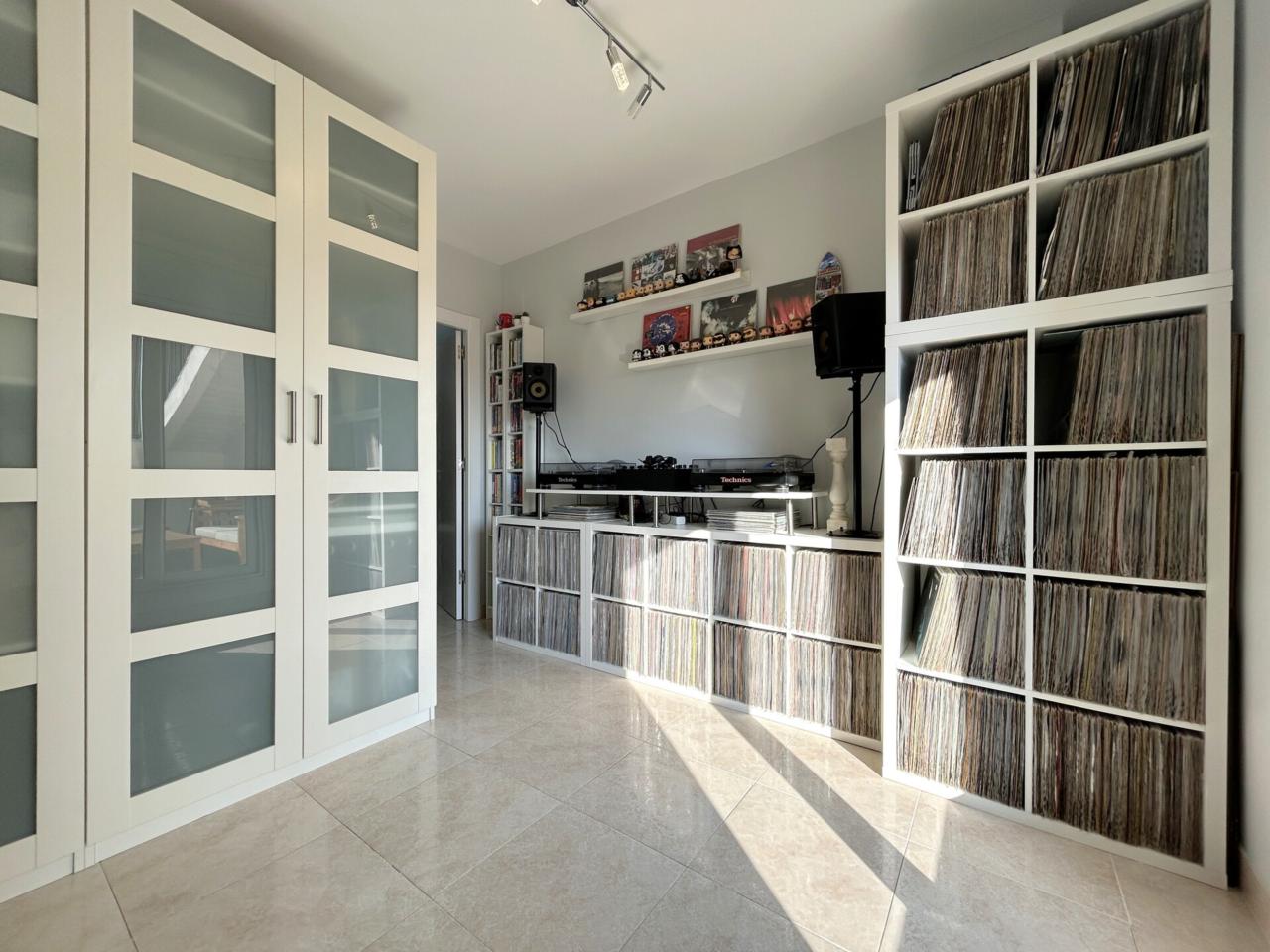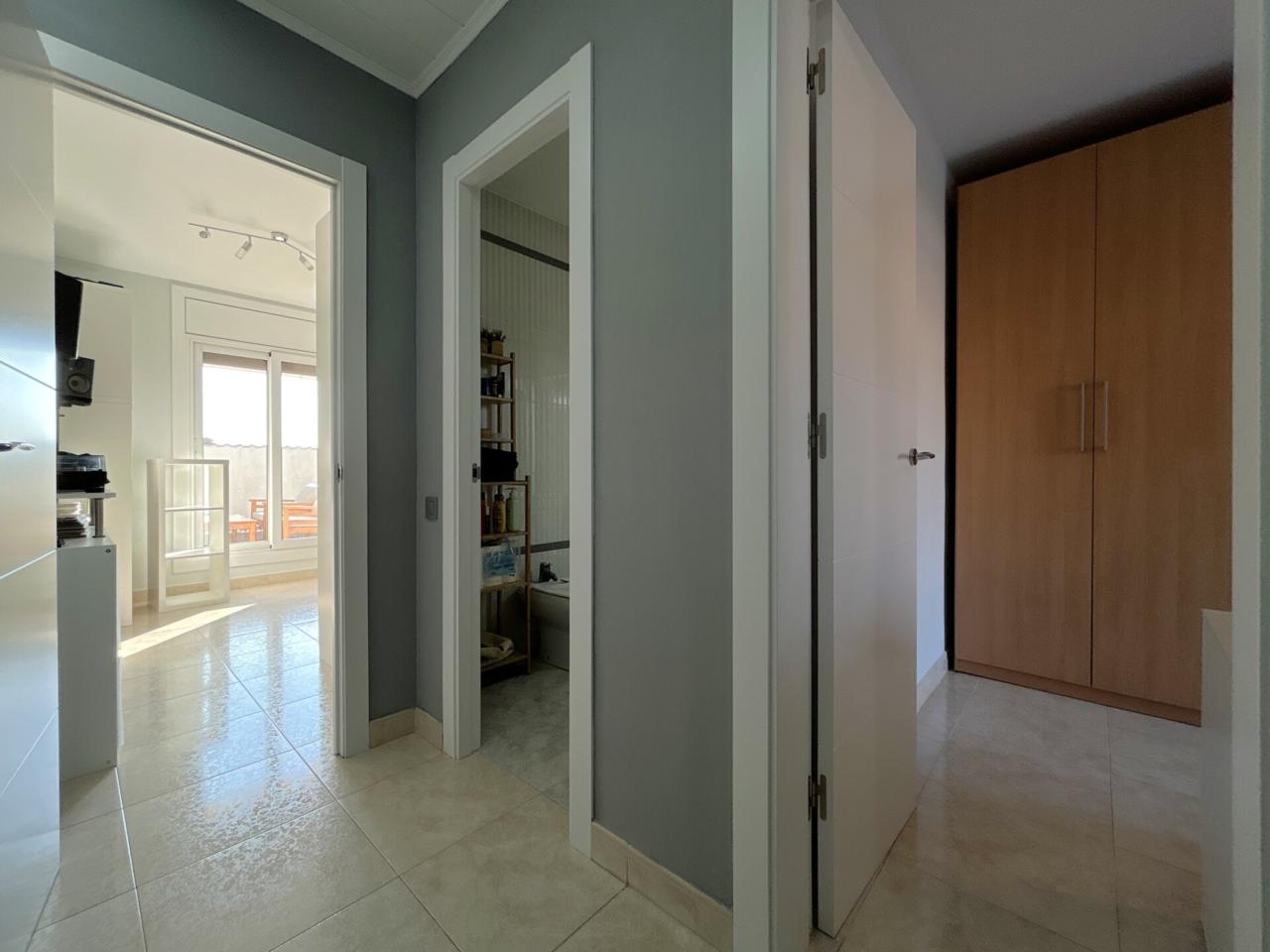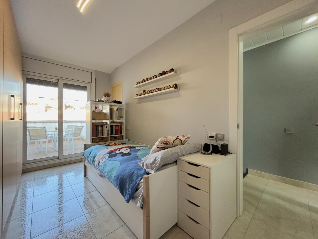 A la planta superior, l’habitatge ofereix una atmosfera més íntima i reservada. Un segon distribuïdor dona accés a un bany ampli amb doble pica i a dues habitacions més. Una d’elles és una habitació individual amb sortida a una terrassa orientada a oest, amb traster, un espai ideal per desconnectar, llegir o simplement gaudir de la llum de tarda.